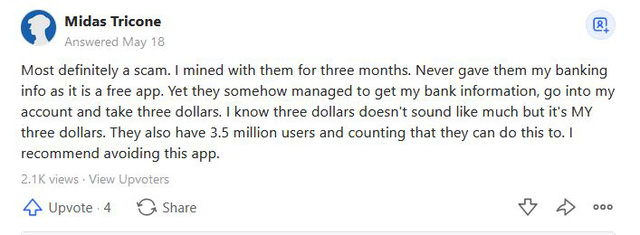 Quan trọng hơn, đã có rất nhiều người kêu mất tiền vì Pi Network trên mạng xã hội Quora: Midas Tricone nói rằng anh đã mất tiền từ tài khoản ngân hàng sau khi cài và sử dụng Pi Network App.