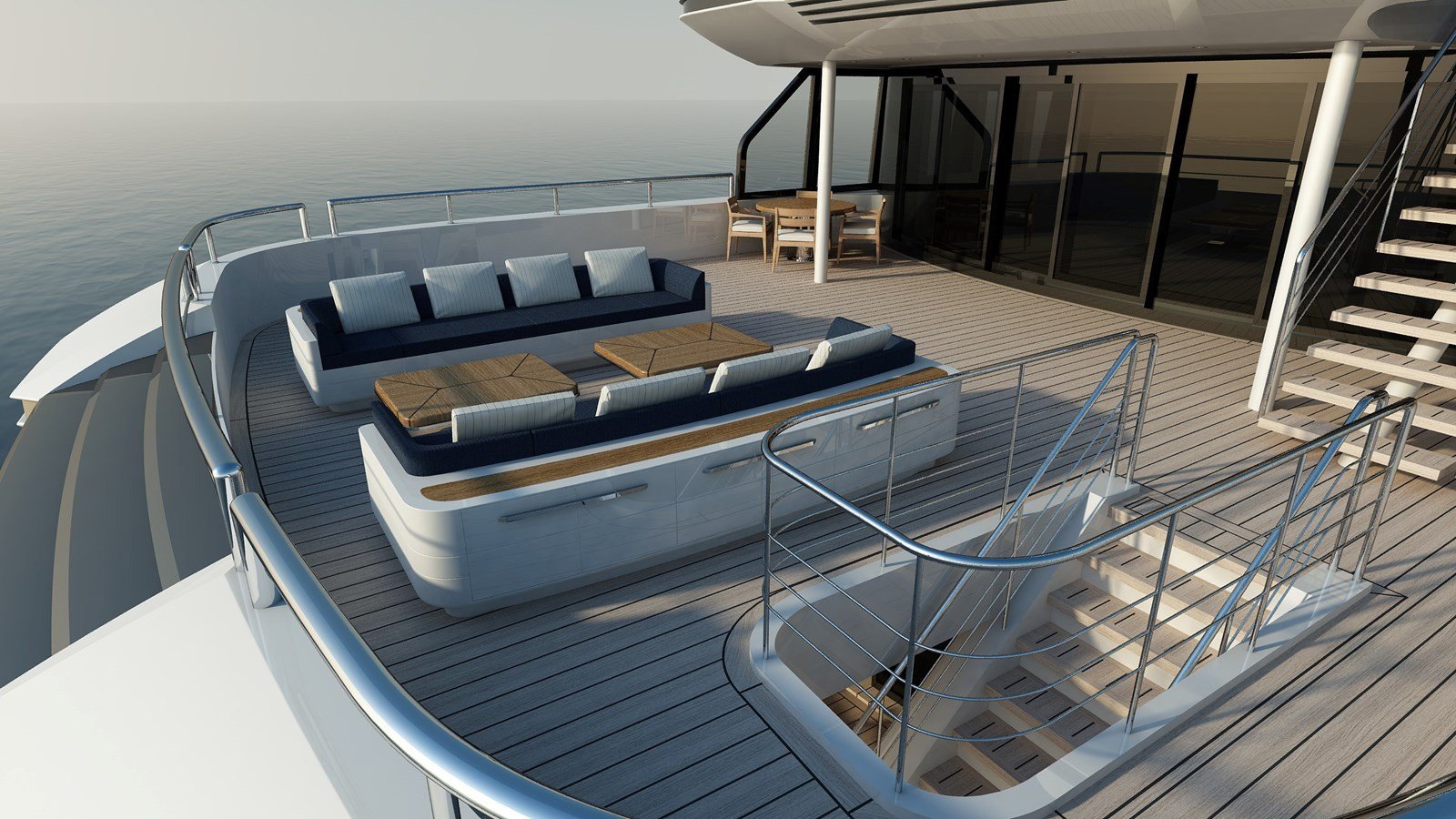 Ngoại thất và nội thất của Soaring do Focus Yacht Design thiết kế. Bên trong, một màn hình TV cỡ lớn ngăn cách không gian tiếp khách rộng rãi với khu vực ăn uống sang trọng.